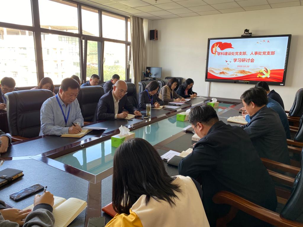 2020年10月20日下午学科建设处党支部、人事处党支部在综合服务楼6006会议室联合召开支部学习研讨会,校长陈克正出席会议并发表重要讲话,人事处处长王雷主持会议。