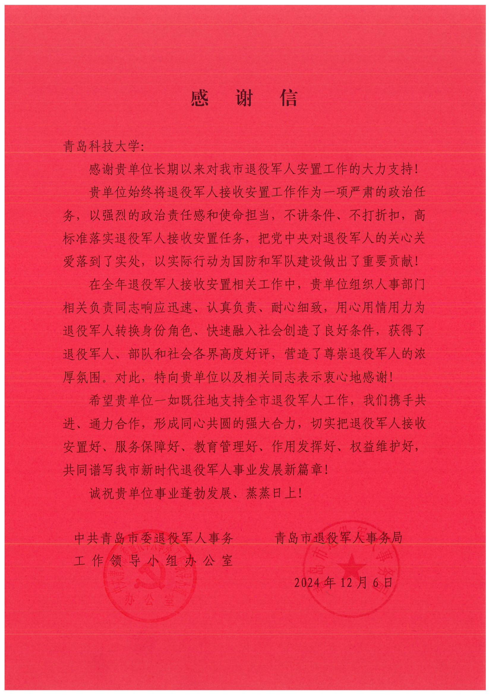 近日,青岛市退役军人事务局发来感谢信,对学校退役军人接收安置工作表示感谢。