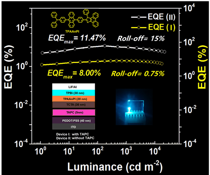 团队成员通过巧妙的分子设计合成了一种新型的D-π-A结构纯有机蓝光分子(TPAAnPI),进一步通过调控不同的器件结构获得了最大电致发射峰470 nm,最大电流效率18.90cd/A,最大功率效率12.35 cd/A,最大发光亮度29900 cd/cm2的非掺杂电致蓝光器件,而最大外量子效率高达11.47%,相应的激子利用率近100%,突破了有机荧光分子最大外量子效率理论值25%的上限。同时,当发光亮度在1000 cd/m2时,器件的外量子效率仍然高达近10%,显示出非常低的效率滚降和器件稳定性,是目前文献报道的同类器件中最好性能。同时,通过光物理实验和理论计算模拟研究表明,由于该分子形成了一种特殊的激发态(杂化局域电荷转移态:HLCT)以及高能三线态激子(T12)的利用,解决了其T1激子积累导致器件效率滚降的问题,使其获得了高效率、低滚降、非掺杂的纯有机电致蓝光器件。该研究为探索HLCT态机制下的三线态到单线态激子上转化的蓝光分子设计和器件优化提供了新的分子设计思路,并为显示和照明等应用领域提供了新型OLED材料体系。