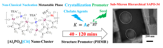 发表于Chemical Engineering Journal(2020, 381, 122759),题为A chemical approach for ultrafast synthesis of SAPO-n molecular sieves的工作中,作者利用柠檬酸与铝离子的耦合作用,显著促进了分子筛前驱体成核,并缩短了磷酸铝分子筛的晶化合成周期,实现了化学策略下的快速合成技术。这种化学促进作用能将晶化合成周期从数十小时,缩短到两小时,并显著区别于现有的物理促进合成技术。相关规律与机理研究表明,借助于柠檬酸等螯合剂的耦合作用,可以简洁的促使分子筛前驱体形成介稳态半晶体纳米团簇,加快成核与晶化。动力学研究表明该促进作用改变了晶化速率常数中的指前因子,而非晶化生长活化能。作者将此现象关联为非经典成核生长。在此基础上,进一步调控分子筛的结构形成多级孔分子筛,其在催化甲醇制烯烃过程中表现出优异的催化性能。值得指出,基于上述研究工作原理创新,所得到的技术创新性得到了国家专利局的肯定。以该工作申报的国家技术发明专利以原文无复议的形式,很快得到了授权(ZL201910079388.1)。该工作得到了中国天辰化学工程公司的大力支持,相关规模化试验工作正在进行中。胡茂从博士为论文撰写布局,材料科学与工程学院研究生王添漪完成了实验工作,李霞与王志义教授提供了重要的理论指导,刘旭光博士提供了研究思路并主导了研究工作。