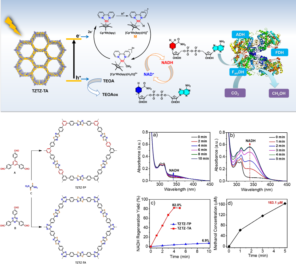此前,李志波教授和赵英杰教授团队在研究全共轭共价有机框架材料时发现三嗪单元的引入能够赋予材料较高的光催化活性,这类材料在光催化NADH再生方面往往具有优异表现(Journal of the American Chemical Society, 2020, 142, 5958-5963)。最近,团队与高性能聚合物研究院丁乃秀教授、材料学院刘健教授合作,通过无催化剂添加的方法制备了噻唑并噻唑类共轭多孔聚合物TZTZ-TA和TZTZ-TP。其中,含三嗪结构单元的TZTZ-TA催化 NADH再生效率5分钟内即可达到82%。将TZTZ-TA与酶结合后能够实现二氧化碳到甲醇的高效和高选择性转变,甲醇浓度5分钟即可达到163.1 μM。该研究成果已经发表在一区期刊ACS Applied Materials & Interfaces上,题目为“Construction of Thiazolo[5,4-d]thiazole-based Two-Dimensional Network for Efficient Photocatalytic CO2 Reduction”,第一作者为王元成博士和博士生刘辉。