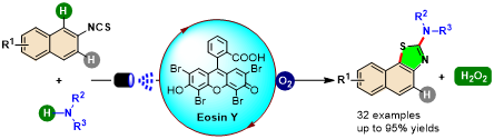 传统的构建2-氨基苯并噻唑及其衍生物的方法主要有过渡金属催化邻卤代异硫氰酸芳基酯和胺的缩合环化;过渡金属催化基于C-H键活化策略的芳基硫脲分子内环化反应;2-氨基苯硫酚与异硫氰酸酯的缩合等。2017年,武汉大学的雷爱文教授课题组报道了一种基于电催化氧化脱氢气高效构建2-氨基苯并噻唑的方法;同年,河南师范大学的范学森教授和张新迎教授课题组报道了氧气条件下,碘催化异硫氰酸芳基酯和胺反应构建2-氨基苯并噻唑衍生物的新途径。虽然这些方法,对2-氨基苯并噻唑类化合物的构建起到了重要作用,但是这些反应往往用到过渡金属催化剂、较高的反应温度、原料不易制备、底物范围较窄等缺点。2-氨基萘并[2,1-d]噻唑类化合物是2-氨基苯并噻唑类核心骨架的重要衍生物。然而,文献调研表明构建2-氨基萘并[2,1-d]噻唑类化合物的方法极其有限。因此,发展新颖、高效、高选择性构建2-氨基萘并[2,1-d]噻唑类化合物的方法具有重要意义。可见光是一种绿色的能源,通常被认为是一种理想的有机转化反应促进剂。近年来,光氧化还原催化各种化学键的活化和功能化已成为有机化学中重要的合成策略。毫无疑问,可见光诱导C-H/S-H键的交叉脱氢偶联是构建C-S键最直接高效的途径。