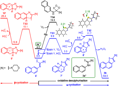 为了弄清楚该反应环化过程的区域选择性问题,以及脱氢环化反应和氧化脱硫反应的竞争过程(具体信息参考文章附件),杨道山教授课题组和曲阜师范大学蒋原野老师合作运用计算化学的方法对反应机理进行了研究。计算结果表明,脱氢环化首先通过激发态Eosin Y以能量转移机制激发三线态氧气形成高能单线态氧气,然后对中间体3a''抽氢形成6'和HOO•。6'再依次经历环合、单电子转移和脱质子完成脱氢环化(图2)。结合共振式分析和能量计算可知,α-环合过程比β-环合过程所产生的中间体更加稳定(7'和8'分别对比9'和10'),导致α-脱氢环化整体上快于β-脱氢环化。另一方面,光催化产生的高能单线态氧气足以使抽氢过程(3a''→6')在热力学上有利的同时又可得到活泼自由基中间体(6'和HOO•)以快速完成后续反应,因此α-脱氢环化反应比氧化脱硫反应有利。