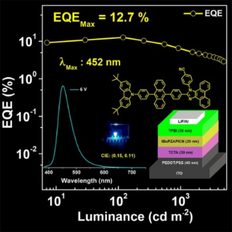 在有机电致发光二极管(OLED)全色显示中,50%以上的功率消耗来源于蓝光,而蓝光饱和度越高、色坐标CIEy值越小,OLED全色显示中的功耗就越低,就越可以复现出更多色彩饱和的画面,OLED全色显示器件的使用寿命和稳定性就越好。因此,如何实现具有高色纯度、高发光效率的纯蓝有机发光材料与OLED器件是该领域的关键科学问题之一。