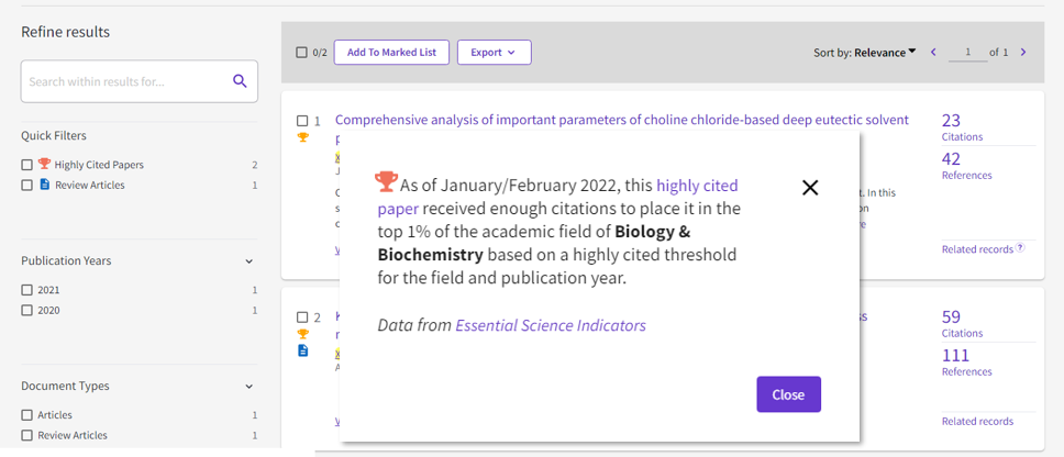 近日,据Web of Science数据库2022年最新检索报告显示,化工学院徐环斐副教授团队的两篇学术论文同时入选ESI“世界前1%高被引论文”。世界前1%高被引论文(ESI Highly Cited Papers)指近10年内发表且在同年度同学科领域中引文影响力排在前1%的论文,是衡量高校学术影响力的重要标志之一。研究内容属于生物质化工领域,围绕基于低共熔溶剂预处理的木质纤维素类生物质的高值化利用展开。两篇学术论文均是发表在该领域国际知名期刊BIORESOURCE TECHNOLOGY(中科院一区TOP期刊,影响因子为9.642)。两篇论文中,今年会官方网站均为第一单位和唯一通讯单位。