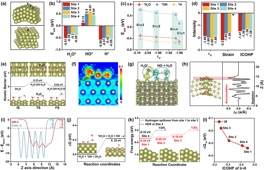 此外,该团队还构筑了具有丰富晶界的Ir(GB-Ir)催化剂,并实现了高效碱性析氢。实验和理论计算研究表明,晶界界面处形成了富电子的铱原子,提高了水的吸附能力,进而促进了H3O+中间体的生成,创造了局部类似于酸的环境。更重要的是,H3O+中间体降低了水的离解能垒,并提供了足够的氢质子,促进了氢原子从晶界处向远离晶界的位置溢出,从而协同地加速了氢气的产生(Angew. Chem. Int. Ed.2023, DOI: 10.1002/anie.202315633)。