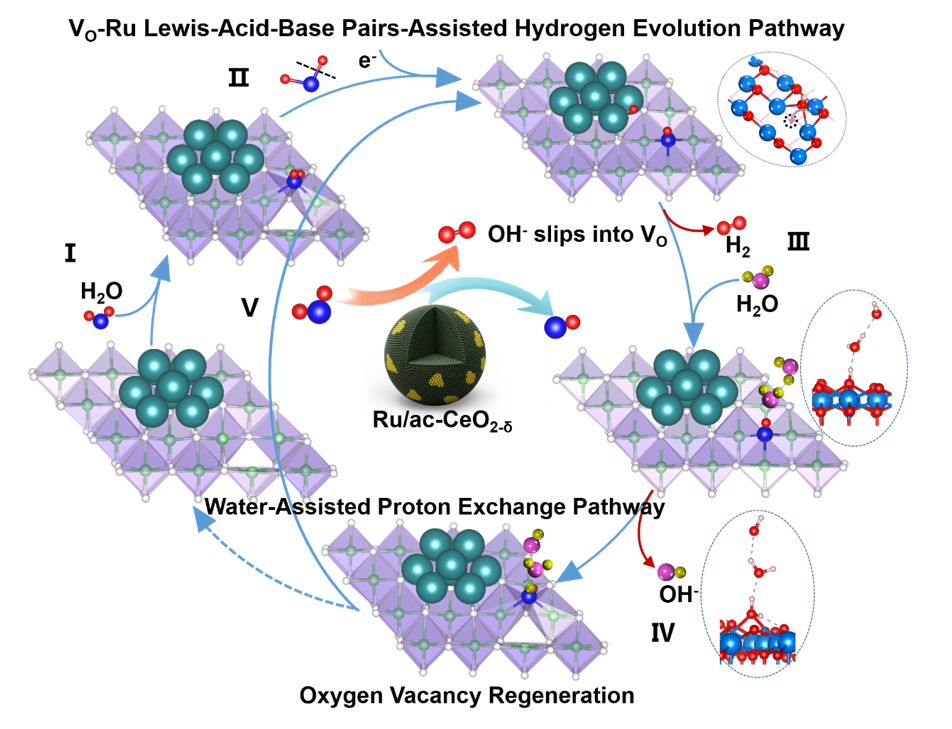 同时优化水解离、氢气和OH解吸的能级是获得快速的碱性析氢反应动力学的关键。基于此,刘教授团队设计了一种无定形/结晶异相CeO2-δ负载Ru团簇纳米催化剂(Ru/ac-CeO2-δ),通过构建独特的氧空位(Vo)和Ru路易斯酸-碱对(Vo-Ru Lewis acid–base pairs)极大地促进碱性析氢动力学。实验结合理论计算研究表明,作为路易斯酸位点的氧空位促进了水的吸附、活化和H-OH键的断裂;同时,由于金属-载体相互作用弱化了Ru团簇的路易斯碱性,从而有利于氢气的解吸。更重要的是,水解离产生的OH滑落进入氧空位之后,可通过水辅助的质子交换路径(VO-OH* + H2O(aq)→VO---H2O* + OH–(aq))很容易地被释放出来,从而完成空位的再生。本研究为高效碱性析氢催化剂的设计提供了新思路(Angew. Chem. Int. Ed.2023, e202317622)。
