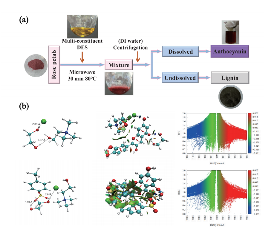 本研究通过设计含有双酸性基团的四元低共熔溶剂,结合微波辅助技术,实现了玫瑰花瓣的快速绿色组分分离。采用了简单高效的方法,成功提高了花青素的提取效率,并实现了纤维素和木质素的分级分离。此外,通过计算化学,有效地从微观角度分析研究了花青素模型在低共熔溶剂中的分布和溶剂化效应。使用密度泛函理论探讨了低共熔溶剂体系与花青素结构之间形成的氢键和弱相互作用。本研究为基于绿色低共熔溶剂体系的玫瑰花高价值应用提供了新思路。研究获得了国家自然科学基金等项目的资助。