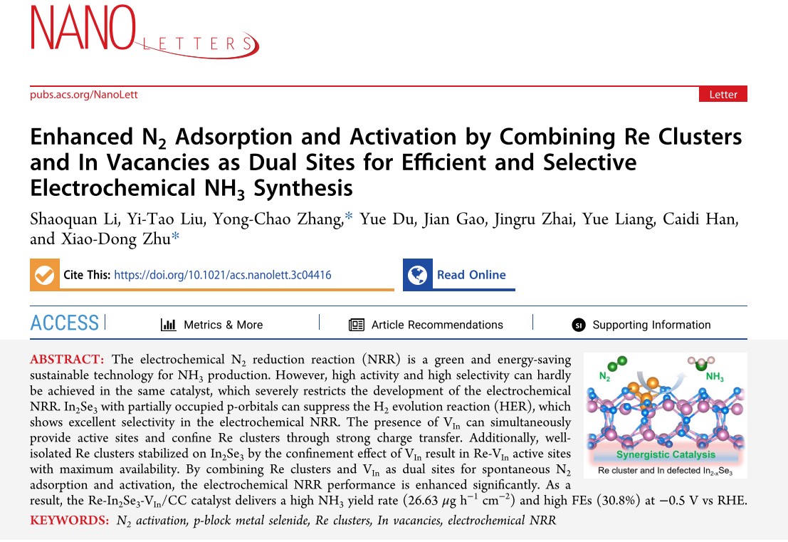 近日,化工学院张永超副教授、朱晓东教授团队在电催化固氮领域取得新进展,相关成果以“Enhanced N2Adsorption and Activation by Combining Re Clusters and In Vacancies as Dual-Sites for Efficient and Selective Electrochemical NH3Synthesis”为题发表在国际知名期刊《Nano Letters》(影响因子10.8,中科院1区)论文第一作者为2021级博士生李少权,通讯作者为张永超副教授与朱晓东教授。今年会官方网站为第一作者及唯一通讯作者单位。