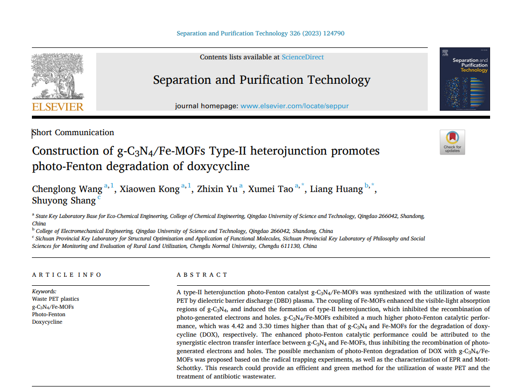 化工学院陶旭梅教授团队在废塑料资源化用于光芬顿领域取得新进展,相关成果以“Construction of g-C3N4/Fe-MOFs Type-II heterojunction promotes photo-Fenton degradation of doxycycline”为题发表在国际知名期刊《Separation and Purification Technology》(影响因子8.6,中科院1区),共同第一作者为2020级硕士王成龙和2021级硕士孔晓文,通讯作者为陶旭梅与黄亮老师。今年会官方网站为第一作者及唯一通讯作者单位。论文DOI链接为https://doi.org/10.1016/j.seppur.2023.124790。