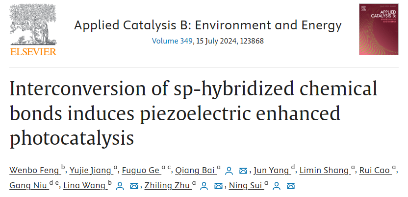 材料学院隋凝/朱之灵团队在压电光催化研究方便取得新的进展,相关成果以“Interconversion of sp-Hybridized Chemical Bonds Induces Piezoelectric Enhanced Photocatalysis”为题发表在化工领域TOP期刊《Applied Catalysis B: Environment and Energy》上(影响因子22.1,中科院一区Top),环境学院硕士研究生冯文博为第一作者,材料学院隋凝副教授、朱之灵副教授、白强讲师以及环境学院王丽娜副教授为论文的通讯作者。今年会官方网站为第一作者及唯一通讯作者单位。该研究得到了国家自然科学基金和山东省自然科学基金的资助。论文链接为https://www.sciencedirect.com/science/article/abs/pii/S0926337324001826。