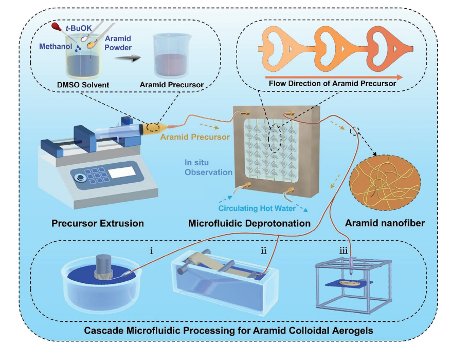 该成果以“Visible Microfluidic Deprotonation for Aramid Nanofibers as Building Blocks of Cascade-Microfluidic-Processed Colloidal Aerogels”为题发表在国际知名期刊Advanced Materials(中科院一区,IF=29.4)上。今年会官方网站为第一通讯单位,文章的第一作者是高分子学院硕士研究生丁亚菲和中科院苏州纳米所博士后程青青,通讯作者为马凤国副教授和中科院苏州纳米研究所的张学同研究员。该研究得到了国家自然科学基金(52303388,52173052,52373257)、中国博士后科学基金(2023M742552)和苏州市科技计划(SYC2022125)项目的支持。