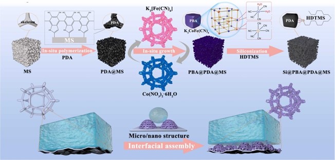 近日,环境学院焦传梅/陈希磊团队报道了构筑超疏水火安全海绵和实现高效油水分离的相关进展。利用仿生设计、界面组装技术、低温碳化策略等技术方法制备了多种具有超疏水、火安全、光热等功能的海绵复合材料,在高效油水分离领域实现了重大突破。在材料学科顶级期刊Advanced Functional Materials(IF: 19)上发表了1篇题目为“A low-temperature carbonization strategy for efficient viscous crude oil spill disposal without hydrophobic coating: CoFe-PBA-catalyzed carbonization of superhydrophobic flame retardant melamine sponge”的文章;在安全科学与工程学科顶级期刊Journal of Hazardous Materials(IF: 13.6)上发表了两篇题目分别为“MOF-derived LDH modified flame-retardant polyurethane sponge for high-performance oil-water separation: Interface engineering design based on bioinspiration”和“A biomimetic design for efficient petrochemical spill disposal: CoFe-PBA modified superhydrophobic melamine sponge with mechanical/chemical durability and low fire risk”的文章。