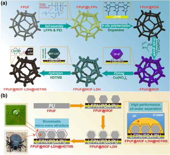 图1 FPUF@MOF-LDH@HDTMS制备(a)及仿生结构设计及油水分离机理(b)示意图