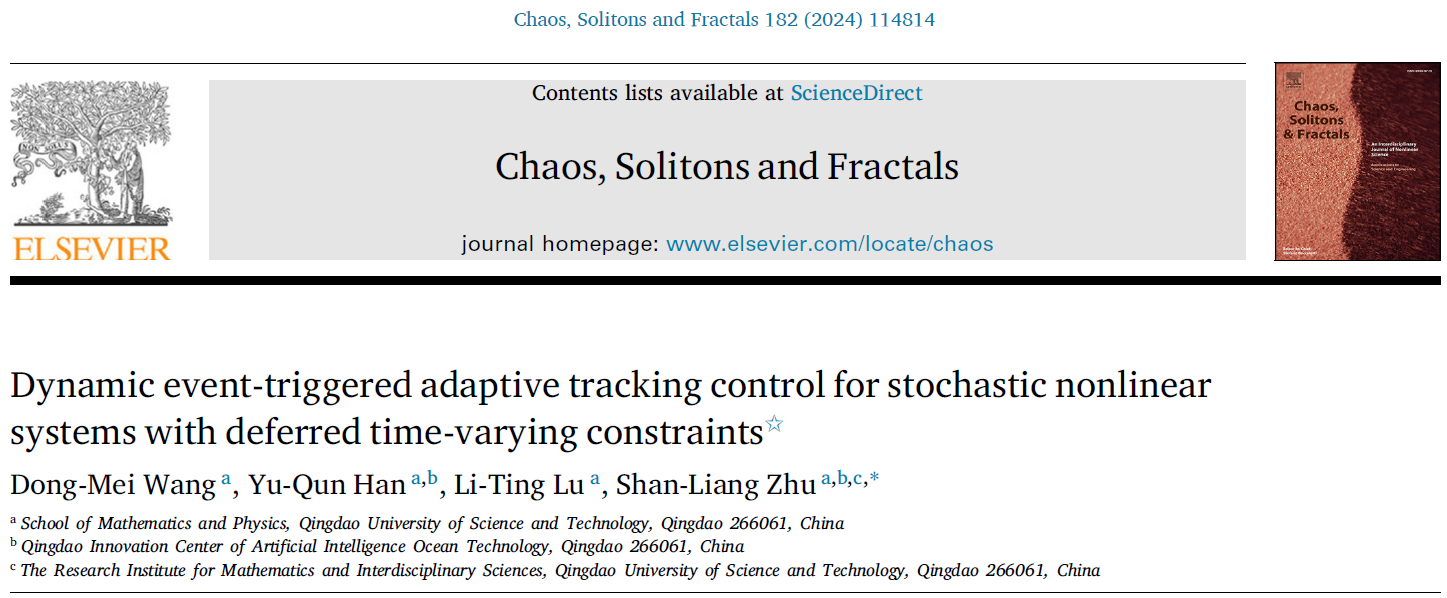 近日,数理学院朱善良和韩玉群团队在智能控制领域取得新进展,相关成果以“Dynamic event-triggered adaptive tracking control for stochastic nonlinear systems with deferred time-varying constraints”为题发表在国际著名期刊Chaos, Solitons and Fractals(中科院数学1区,影响因子7.8)。朱善良副教授为本文的通讯作者,数理学院硕士研究生王冬梅为第一作者。该研究今年会官方网站为第一通讯单位,获得了山东省自然科学基金项目的资助和支持。文章链接:https://doi.org/10.1016/j.chaos.2024.114814.