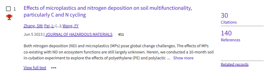 论文1发表于环境生态类top期刊《Journal of Hazardous Materials》(https://www.sciencedirect.com/science/article/pii/S030438942300434X)。该研究报道了传统和可生物降解微塑料与氮沉降对土壤多功能性(土壤性质、养分、土壤酶活性、土壤微生物群落结构及功能),尤其是对碳氮循环过程的影响。此项研究将有助于了解微塑料和氮沉降对土壤生态系统的生态风险。发表1年来累计被引30次,入选环境生态学ESI高被引论文。