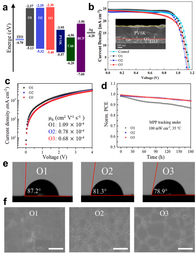 Figure 3. (a) Energy level diagram of each layer of the inverted p-i-n MHPSCs. (b) J–V curves of the champion PTAA (control), O1, O2, and O3-based MHPSCs under 1 sun condition (100 mW cm-2), scanned from the forward direction with a scan rate of 20 mV s-1. The inset shows the cross-sectional SEM image of a typical ITO/O1/PVSK film with estimated thicknesses of 540 nm (for the perovskite layer) and 30 nm for O1 HTM, respectively. (c) Dark J–V curves of hole-only devices with structure “ITO/PEDOT: PSS/HTM/Ag”. (d) Comparison of normalized PCEs of encapsulated O1, O2, and O3-based inverted devices under ambient conditions and light soaking at the MPP (1 sun illumination, 100 mW cm-2; 420 nm UV light cut-off filter; 35 ◦C). (e) Water contact angles (WCAs) for O1 (left), O2 (middle), and O3 (right) HTMs coated on glasses. (f) Morphological SEM images of glass/HTM/PVK films. The scale bar is 1 µm.