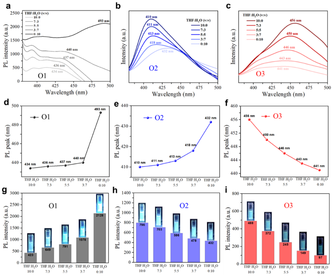 Figure 2. (a-c) Concentration-dependent PL spectra of O1, O2, and O3 solutions with different volume ratios (v:v) of tetrahydrofuran (THF) and water under 5×10-5M, respectively. (d-f) PL peak positions of O1, O2, and O3 solutions vs. different volume ratios (v:v) of THF:H2O, respectively. (g-i) PL intensity of O1, O2, and O3 solutions with different volume ratios (v:v) of THF:H2O and photographs of O1, O2, and O3 in their corresponding solutions under 365 nm UV light, respectively. The PL intensity is corrected with the absorption value at the excitation wavelength for each case.