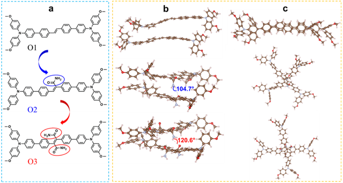 对于O1-O3分子的构象排列预测表明(见图1b和1c),O1二聚体呈现有序的平行堆积模式,具有良好的π-π堆叠特性,这可能有利于空穴传输层内部电荷迁移。相比之下,O2和O3二聚体在两个分子之间表现出明显的扭曲排列,这是由于在核心部分的酰胺基团上形成氢键。与O2二聚体相比,O3二聚体的N-H-O相互作用角更大,表面聚集更无序,这可能不利于有效的空穴转移。因此,氢键相互作用的增强可以逐渐增强反式二苯乙烯核的堆叠,从而增强分子间旋转角的扭曲。