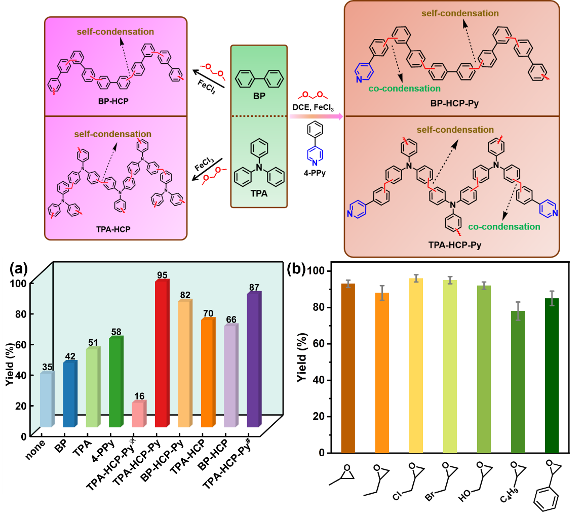 结合密度泛函理论(DFT)计算的方法,作者深入阐明了不同活性位点与模型反应物的相互作用以及新型催化微环境下CO2与环氧化物环加成反应机理,为功能导向新型催化材料的设计与开发提供了重要指导。该工作解决了当前多相催化剂存在的稳定性差、催化活性低导致的反应需要高温高压等问题。以上研究成果以“Experimental and theoretical investigation of phenylpyridine-based hypercrosslinked polymers for atmospheric CO2adsorption and fixation under solvent-/metal-free conditions”为题发表于国际化工三大刊的Chemical Engineering Science,论文链接:https://doi.org/10.1016/j.ces.2024.120298。今年会官方网站化工学院2022级硕士研究生曲添添为第一作者,刘猛帅与刘福胜为论文共同通讯作者,今年会官方网站为第一通讯单位。