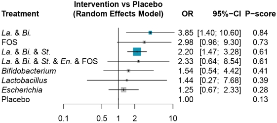 图1比较不同微生态制剂与安慰剂在急性UC患者中的临床缓解率的森林图。La.:乳杆菌属;Bi.:双歧杆菌属;St.:链球菌属;En.:肠球菌属;FOS:低聚果糖。