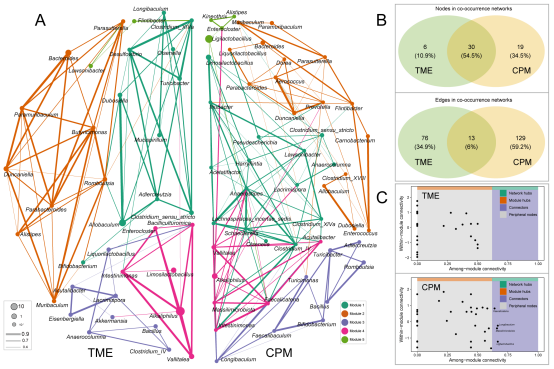 图2不同处理组小鼠肠道微生物属水平网络分析。(A)美沙拉嗪治疗组(左)和联合治疗组(右)网络;(B)两个网络之间节点和边的维恩图;(C)基于节点拓扑角色的Zi-Pi图。网络中的每个节点代表一个细菌属。节点大小表示一个属的平均相对丰度。边宽度表示支持此连接的相关性值。节点和边的颜色代表不同的模块。TME:治疗性美沙拉嗪;CPM:复合益生元联合美沙拉嗪。