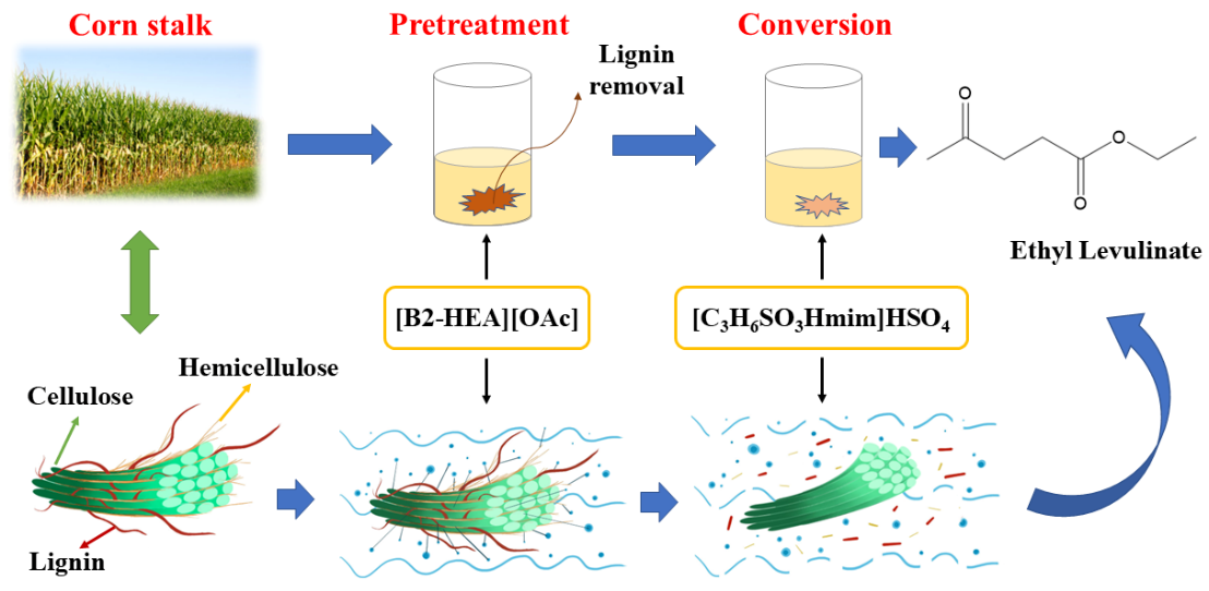 来自农作物秸秆的木质生物质是一种丰富且廉价的可再生资源,可以转化为高价值的平台化学品。木质生物质拥有复杂的三维结构,其主要组分纤维素、半纤维素和木质素之间通过氢键和共价键牢固地相互结合,因此木质生物质通常都不容易被降解,需要一系列有针对性的预处理。质子型离子液体是一种结构稳定、酸性可调且可循环使用的新型催化剂,具有优异的溶解纤维素的能力,通过降低纤维素的结晶度,进一步增强其水解/醇解性。