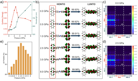 图2. 理论计算AN-Azo-AN在高压下激发态的振子强度、发射波长、自然跃迁轨道、跃迁密度矩阵以及局域激发成分占比