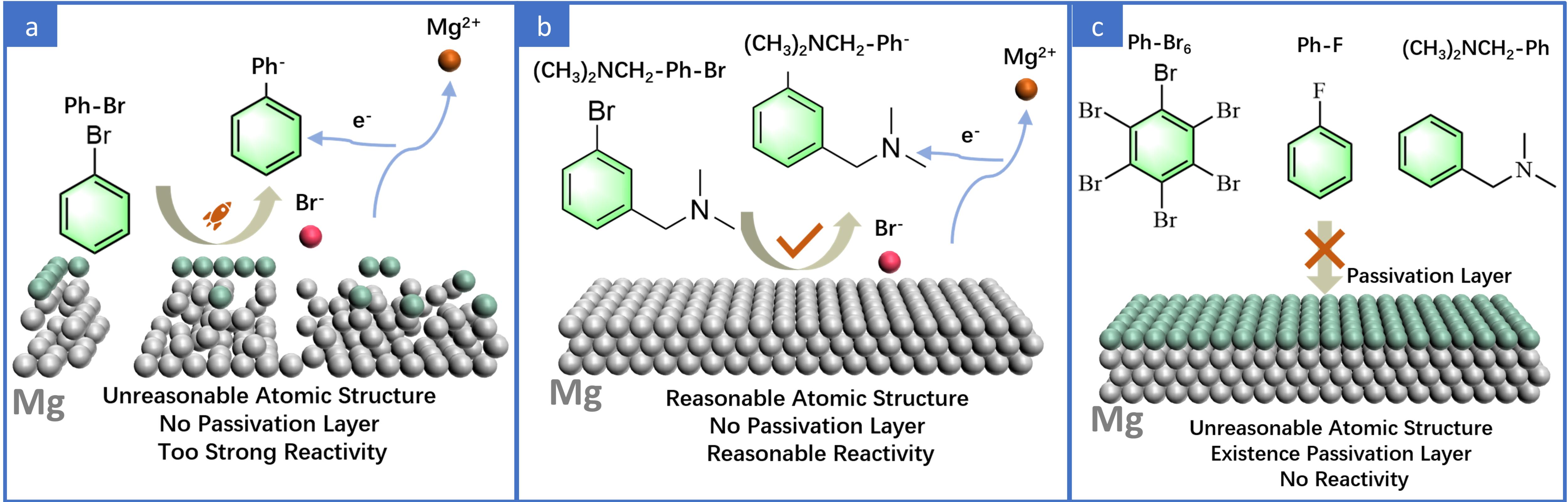 研究团队首次提出了在简单盐电解质中恢复镁(钙)金属阳极的组分改性剂的重要设计原则。基于供电子和/或吸电子取代基对Br-C键离解反应性影响的分子级设计原理。具体来说,在溴苯基配合物上接枝和/或取代-F、-NH2、烷基、叔胺官能团可以有效地操纵它们对镁金属及其表面氧化物的反应性,这是由于通过耦合电负性和/或p-π共轭、σ-π超共轭效应增强和/或削弱了Br-C键。因此,选择1-(3-溴苯基)-N,N-二甲基甲胺(BPDMA)是因为与其他组分改性剂相比,它显示出平衡的Br-C键解离反应性、对Mg箔的适度腐蚀性、高溶解度和较低的析氢反应倾向。BPDMA作为添加剂首次实现了优异的镁电镀/剥离性能,如超长的循环寿命(超过3000次循环,250天)、低镁电镀过电位(~250 mV)和99.39%的满意库仑效率。此外,这种简单的组分改性策略也可以扩展到低成本的Mg(SO4)2基电解质和Ca2+离子电解质,证明了其优越性和通用性。