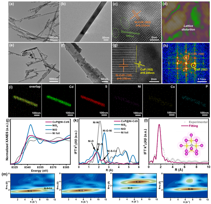 基于半导体光催化分解水制氢技术将取之不尽用之不竭的太阳能直接转化为环境友好的氢能,有望克服日益增长的能源需求和环境污染危机问题。CdS光催化剂具有合适的带隙、能带结构,并满足将质子还原为氢气的热力学要求。然而,纯CdS的光催化活性往往受到光生电子-空穴对的严重复合以及对H2O分子和H*中间体的不合适的吸脱附性限制。为解决以上问题,本研究在CdS纳米棒中掺杂磁性Ni元素并负载CoP纳米颗粒构建了具有串联双电场的肖特基异质结光催化剂。系列实验和理论计算证实原子分散的Ni原子以Ni-S-Cd配位形式掺杂到CdS的晶格中,引起了CdS晶格畸变,增大其分子偶极矩,进而诱导自旋极化电场的形成;并且磁性Ni原子的掺杂增大了CdS与CoP的费米能级差,有助于增强内建界面电场强度。自旋极化电场与增强的内建界面电场协同加速光生电荷分离与迁移动力学,并优化活性位点的电子构型,加速析氢反应动力学,从而实现高效的光催化析氢。