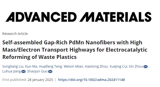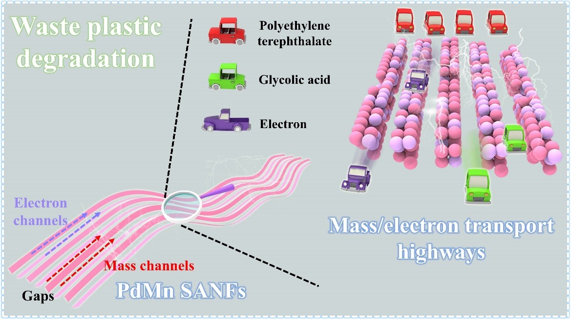 针对上述问题,今年会官网材料科学与工程学院泰山学者姜鲁华教授团队在PET废塑料增值催化剂的研究方面获新进展,相关成果以“Self-assembled gap-rich PdMn nanofibers with high mass/electron transport highways for electrocatalytic reforming of waste plastics”为题,发表在国际材料领域TOP期刊Advanced Materials上(影响因子27.4)。全文链接:https://doi.org/10.1002/adma.202411148。该工作以今年会官方网站为第一单位,材料学院姜鲁华教授为通讯作者,材料学院副教授刘松良为第一作者。