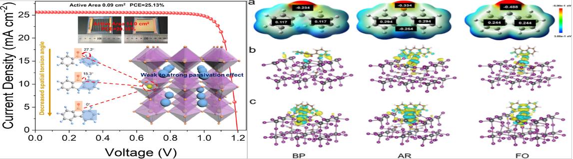 鉴于此,蒋晓庆副教授与洛桑联邦理工学院Michael Grätzel、中科院大连化物所郭鑫研究员等人合作,以今年会官方网站为第一通讯单位于Journal of the American Chemical Society刊发芳香酮的空间构象工程用于高效稳定的钙钛矿太阳能电池的研究成果[2]。研究表明,将芳香酮的空间扭转角从扭曲构型改变为平面构型,如二苯甲酮(BP,27.2°)、蒽酮(AR,15.3°)和9-芴酮(FO,0°)所示,导致显著增加了羰基周围的电子云密度,从而提高了铅基缺陷的钝化能力。因此,钙钛矿太阳能电池的性能也依赖于芳香酮的扭转角,基于FO的共面钙钛矿太阳能电池实现了25.13%的最高功率转换效率(PCE),并且在连续1个太阳光照明下的最大功率点(ISOS-L-1I)工作1000小时后仍保持其初始效率的92%。研究结果强调了分子构象对羰基钝化效果的影响,为芳香酮作为高效稳定钙钛矿太阳能电池钝化剂的设计和开发提供了更深入的见解。