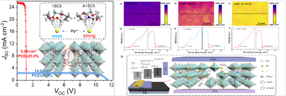 近日,化工学院蒋晓庆副教授与洛桑联邦理工学院Michael Graetzel教授、中科院青岛生物能源所逄淑平研究员、新加坡国立大学魏明杨教授等研究人员合作,以今年会官方网站为第一通讯单位于Angewandte Chemie International Edition刊发主客体复合物中定制的超分子相互作用用于高效稳定的钙钛矿太阳能电池和模块的研究成果[1]。确定了冠醚与阳离子的超分子相互作用受到环腔内电荷密度分布的影响,由分子偶极矩的大小表示。通过取代杂原子使冠醚实现的更大的偶极矩增强,较高的分子极性使供体原子周围负部分电荷的分布扩大,提高其对软路易斯酸的电子供体能力,与铅阳离子的配位性得到改善。采用氮杂冠醚作为添加剂的钙钛矿薄膜表现出更好的形态、更低的缺陷密度和更好的能级对齐。在此基础上,PSC的功率转换效率(PCE)超过25%,显示出更好的长期稳定性,而基于氮杂冠醚的钙钛矿太阳能模块(14.0 cm2)的PCE为创纪录的21.5%。