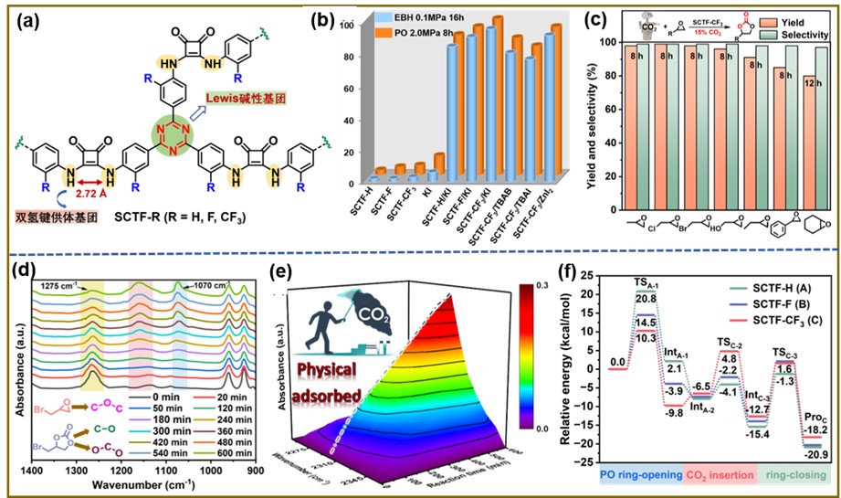 近日,化工学院刘猛帅/刘福胜团队在合理设计功能单体的基础上,采用简易离子热共缩聚法,成功创制出系列方酰胺衍生基三嗪有机框架(SCTF-R;R = H, F, CF3)催化剂,并系统研究了其结构特性。结果表明该新型催化剂具有高比表面积(605-833 m2/g)与规整的孔隙结构,同时包含高密度氢键供体与CO2亲和位点。在273 K和1.0 bar CO2压力下,SCTF-CF3对CO2吸附能力达2.5 mmol/g;将SCTF-R应用于低浓度CO2与环氧化物的环加成反应,对比研究了催化剂活性位点及反应工艺参数等因素对产品收率和选择性的影响,发现以SCTF-CF3为催化剂,在温和、无金属、无溶剂条件下可高效催化低浓度CO2转化合成溴丙烯碳酸酯,展现出优异的催化活性和循环稳定性。这主要归因于催化体系中活性位点的合理构建及其协同作用,显著增强了对CO2的吸附活化以及环氧化物的活化与开环能力。