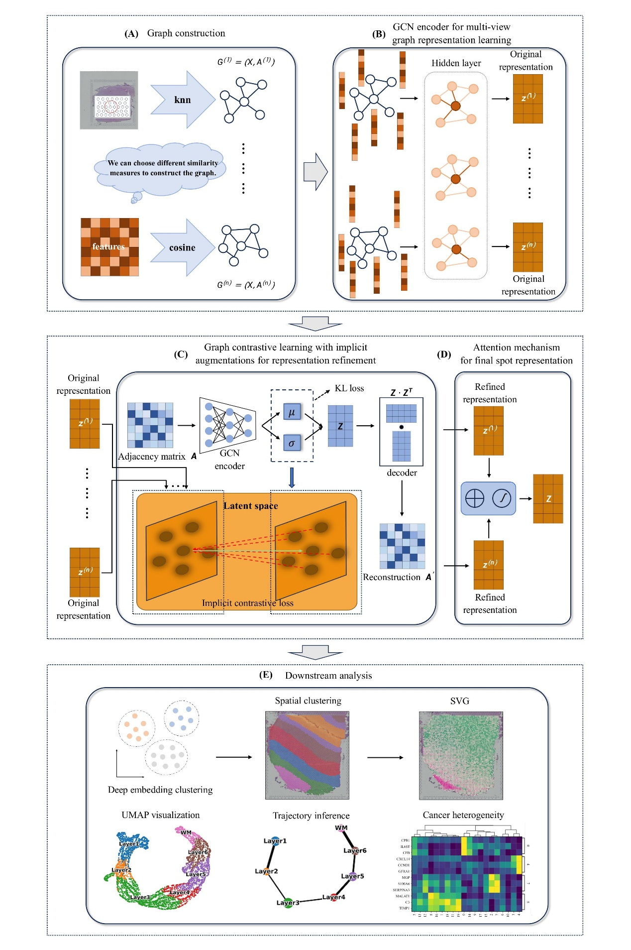 研究团队提出一种基于隐式对比学习的多视图图卷积网络框架,称为 STMIGCL。STMIGCL 借助空间转录组数据中的基因表达谱以及空间位置信息,运用不同的方法构建多个邻居图,依靠不同视图间的协同学习从数据中提取更为丰富且有效的信息。运用GCN学习每个视图的低维表示,实现图结构与基因表达特征的有效融合。通过将多视图学习与对比学习相结合,STMIGCL可充分利用GCN的独特优势深入挖掘每个视图中的潜在信息,还可以有效整合并利用不同视图之间的互补优势,获取更全面、丰富的信息。进一步利用基于隐式增强的对比学习方法,STMIGCL 显著增强表示的判别能力,优化聚类性能。为了捕捉不同视图嵌入的重要性,STMIGCL 运用注意力机制,自适应融合不同视图的潜在表示,得到最终的斑点表示。通过在多个不同技术平台获得的数据集中进行实验的结果表明,STMIGCL显著提升空间域的识别精度,在轨迹推断、空间可变基因识别等任务中优于现有基线方法。另外,通过在人类乳腺癌数据集上的实验分析结果表明,STMIGCL能够从更精细的层次剖析癌组织的异质性,为制定靶向治疗策略提供理论依据。