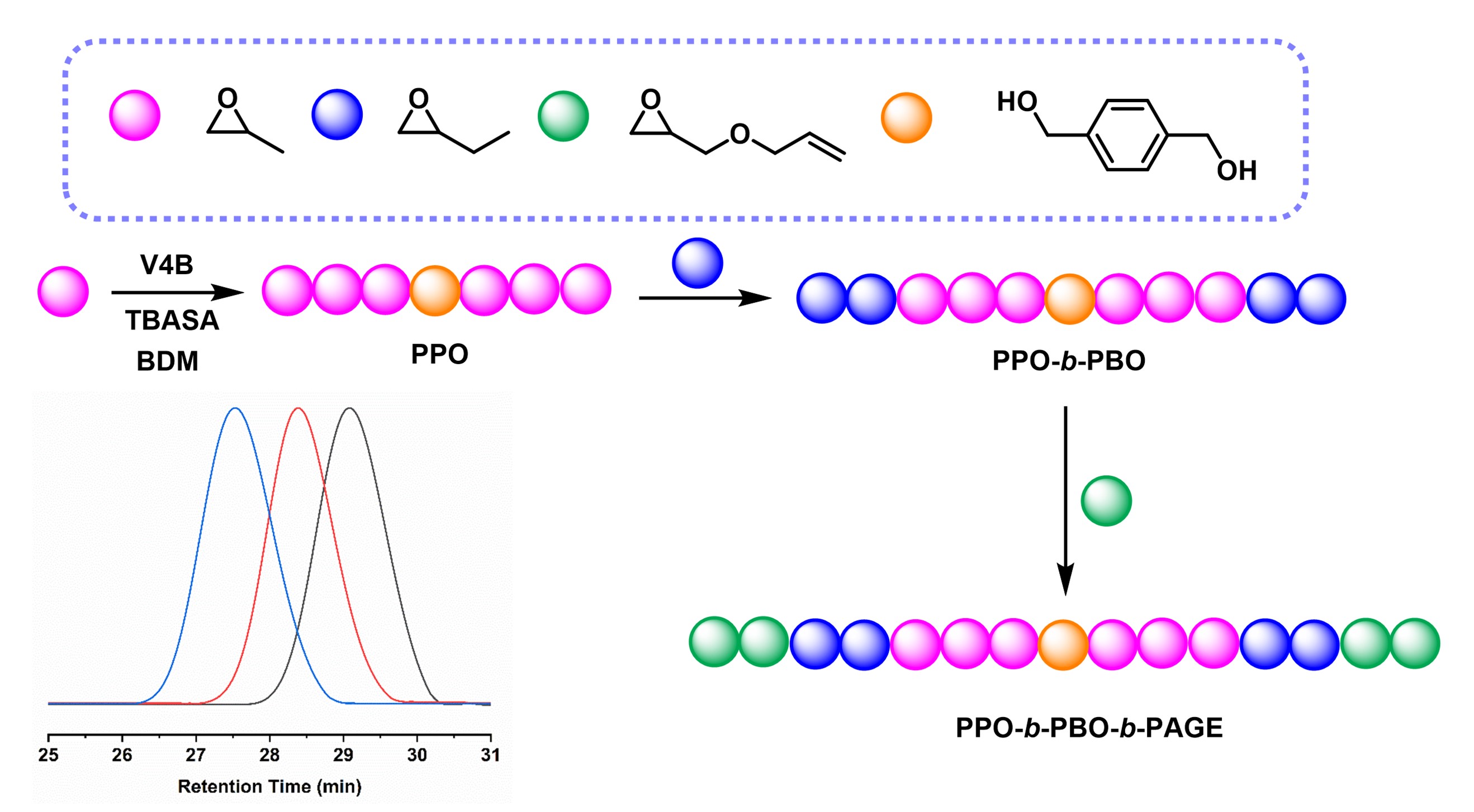 此外,他们利用V4B/TBASA体系的活性聚合特性,成功制备了多种嵌段共聚物。以聚(γ-丁内酯)(PγBL)为大分子引发剂,在V4B/TBASA催化下,合成了结构明确的可降解三嵌段聚醚PPO260-b-γBL56-b-PPO260(Đ= 1.23)。通过串联合成策略,先使PO均聚,再依次加入丁烯氧化物(BO)和烯丙基缩水甘油醚(AGE),制备出五嵌段共聚物PAGE-b-PBO-b-PPO-b-PBO-b-PAGE,分子量为5.7 kg/mol,Đ= 1.10(图10)。这些嵌段共聚物在表面活性剂、药物递送系统等领域具有潜在应用价值。该研究开发的V4B/TBASA二元体系为环氧化物开环聚合提供了一种高效、精准的合成方法。V4B成本较低,有望在聚醚工业中广泛应用。