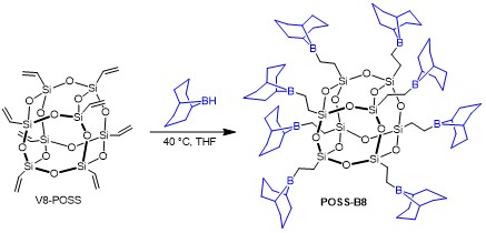 进展一:通过市售的八乙烯基倍半硅氧烷即V8-POSS直接一步反应合成了多核硼烷路易斯酸POSS-B8(图1)。首先,为了评估了POSS-B8的聚合活性,他们选择四丁基氯化铵(TBACl)和琥珀酸四丁基铵盐(TBASA)作为环氧丙烷(PO)本体开环聚合的单官能和双官能引发剂。在[PO]0/[POSS-B8]0/[TBACl]0= 10000/1/1的条件下,POSS-B8在20 min内催化PO本体开环聚合达到99%的转化率,转化频率(TOF)高达3750 h-1/每个硼烷。在[PO]0/[POSS-B8]0/[TBASA]0= 30000/1/1条件下,PO转化率在4.5 h内达到99%。有趣的是,在固定[PO]0/[TBASA]0= 10000/1的比例不变的条件下,[POSS-B8]0/[引发剂]0的比例降低至1/2也可以保持PO中到高等的转化率,该聚合结果凸显了POSS-B8的优势。